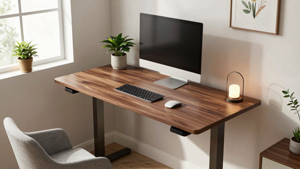 In small apartments, mobility and portability are key factors when selecting a compact standing desk, as they allow you to easily move or store your workspace without hassle. Desks with lockable casters make repositioning straightforward and secure, so your workspace stays stable when needed. Lightweight desks, weighing between 15 to 33 pounds, are simple to carry and shift around your space. Foldable or collapsible designs further boost portability, making storage quick and effortless. Smooth-rolling wheels ensure quiet movement, so you won’t disturb others in your quiet home environment. Many portable standing desks also feature quick assembly, allowing you to set up or pack away your workspace in just minutes. These features make a desk adaptable to your changing needs and limited space.