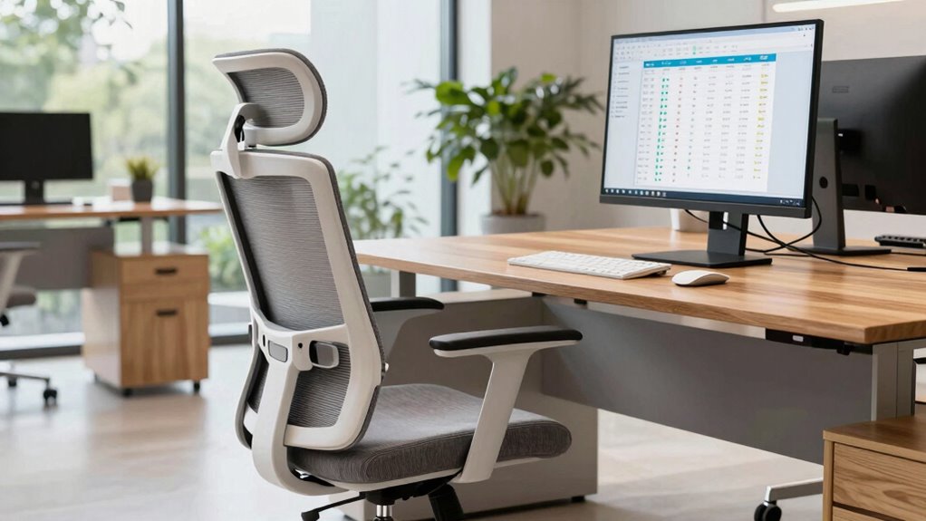 Have you ever experienced discomfort or strain in your lower back after hours of working at your desk? That’s where adjustable lumbar support comes in. It lets you customize the level and position of support to match your spinal curve perfectly. Properly adjusted lumbar support reduces lower back strain and helps you maintain good posture during long hours of spreadsheet work. Many ergonomic chairs offer multi-directional support, allowing movement up, down, in, and out, which adds to your comfort. This adjustability can considerably lower your risk of developing chronic back pain from prolonged sitting. When you can tailor the lumbar support to your body, it improves your overall sitting stability and comfort. That’s essential for staying focused and productive during extended periods of intense work.