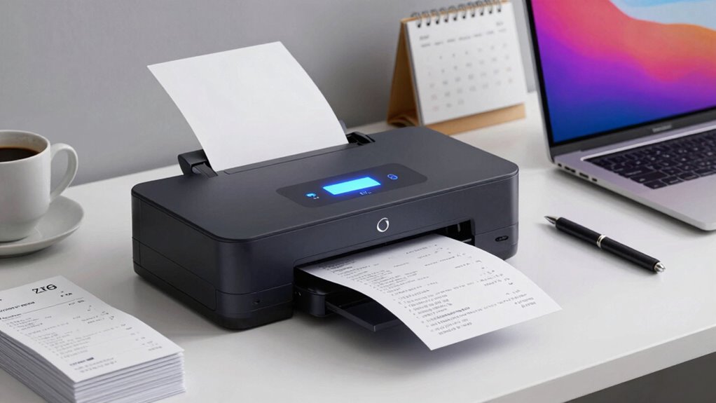 Have you ever wondered how accurately a receipt scanner can turn paper receipts into usable digital data? OCR technology makes this possible by converting scanned images into editable, searchable text. The accuracy depends on factors like scanner resolution, image quality, and the software’s algorithms. High-quality OCR software can automatically extract crucial info such as dates, amounts, and vendor names, saving you time on manual entry. If you often deal with receipts in different languages, multi-language OCR support is a must to guarantee precise data extraction. Additionally, regular software updates and calibration are essential—they keep OCR performance sharp and maintain high accuracy over time. Choosing a scanner with robust OCR features will streamline your expense management and reduce errors.